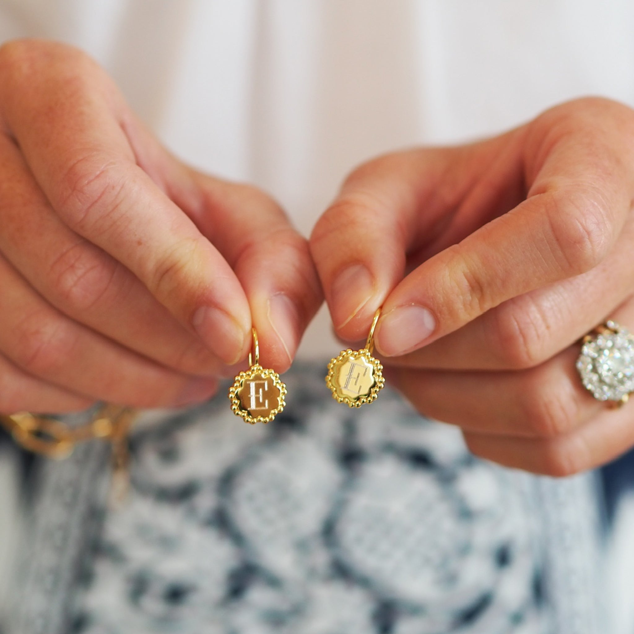 Goldbug Collection’s Scalloped Drop Earrings feature scalloped, beaded edges around plain, personalizable centers.
