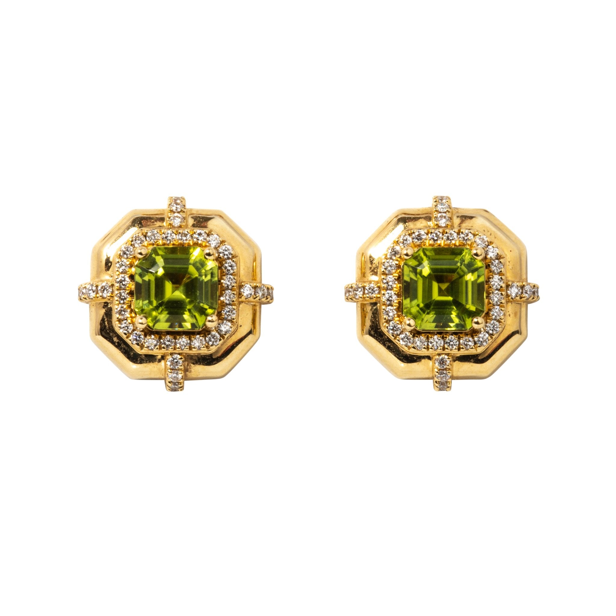 Goshwara Asscher-Cut Peridot Stud Earrings with Diamonds in 18K Yellow Gold