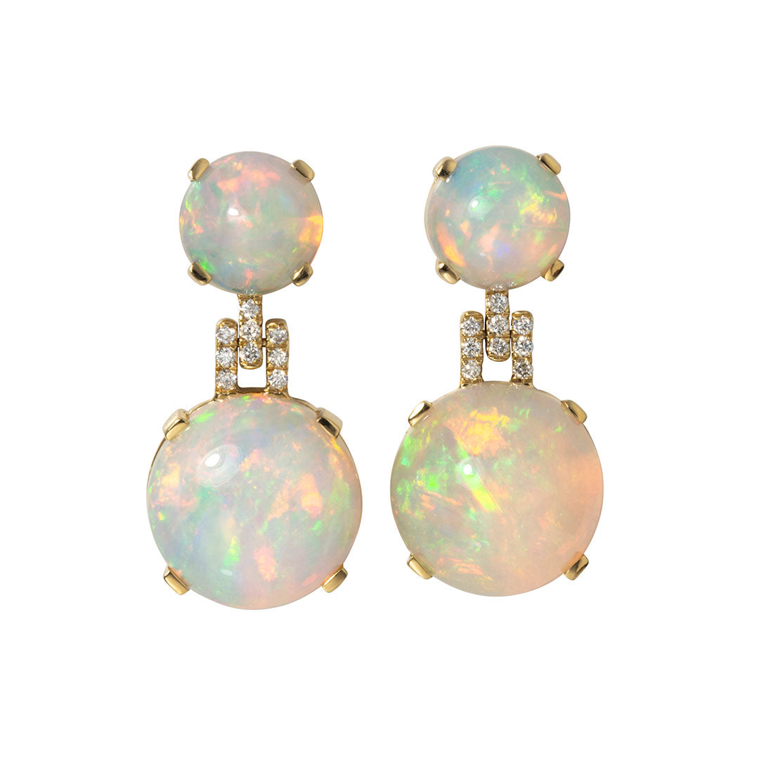 Goshwara 'Rock 'n Roll' Double Drop Earrings feature prong set round cabochon opal and pavé diamond accents in 18K yellow gold.