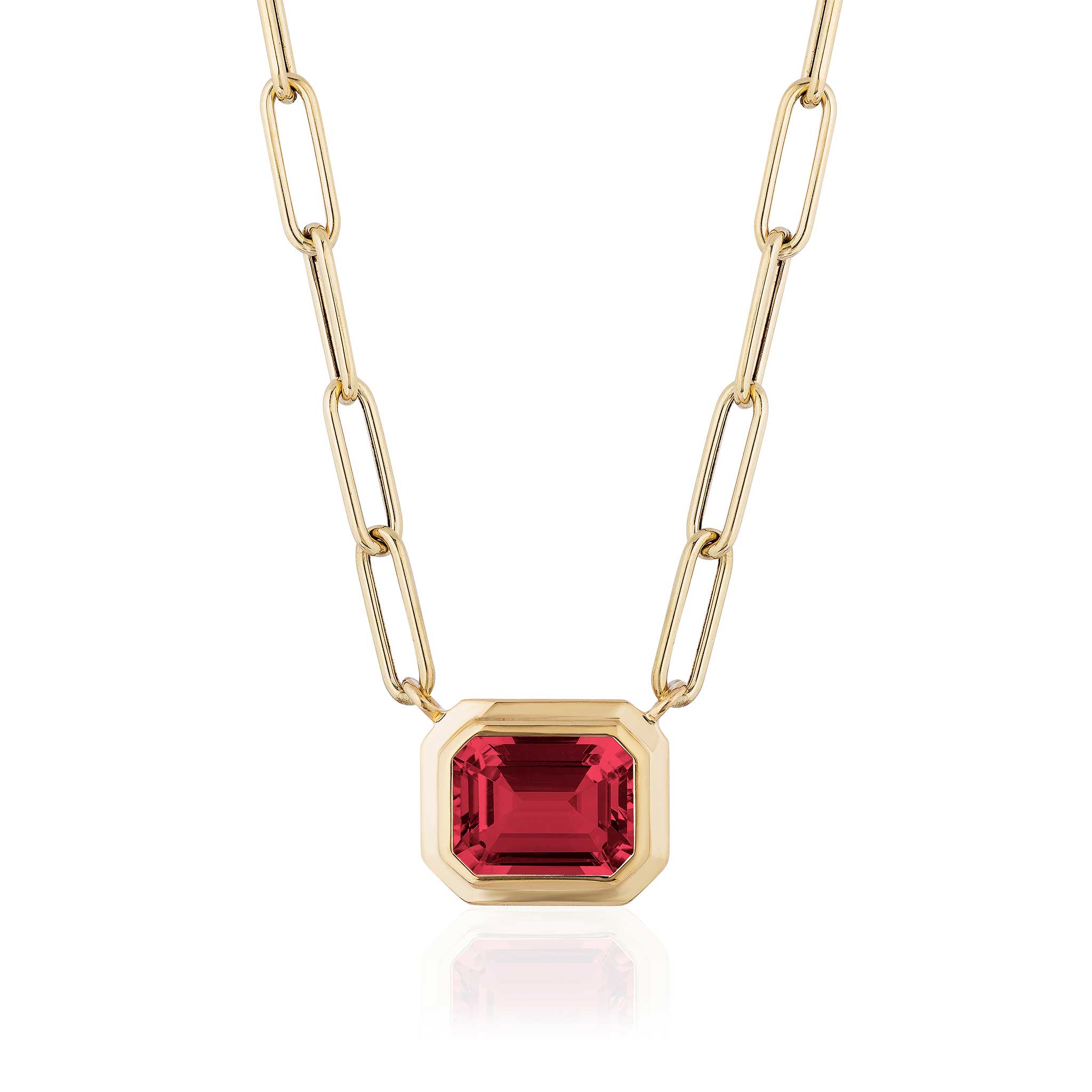 Goshwara 'Manhattan' Emerald-Cut Garnet East-West Bezel Set Pendant Paperclip Chain Necklace in 18K Yellow Gold