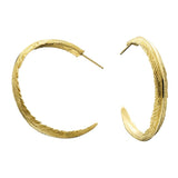Grainger McKoy Narrow Feather Earrings are thin, lightweight feather open hoops handmade in 14K yellow gold.
