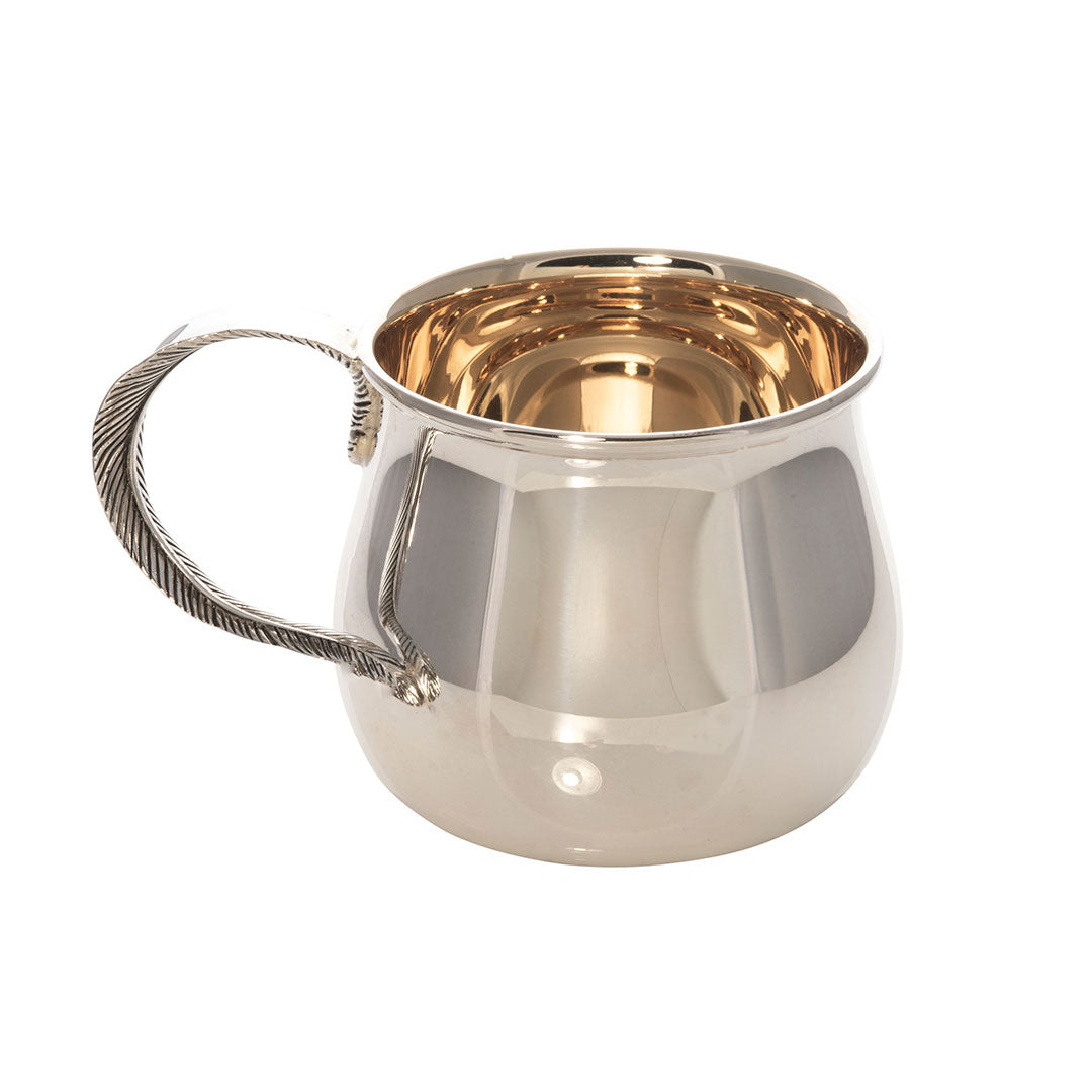 Grainger McKoy Bulged Sterling Silver Baby Cup features bulged sides and an elegant feather handle hallmarked with “Grainger.” Each cup is made with over 100 grams of hand-spun .925 silver.