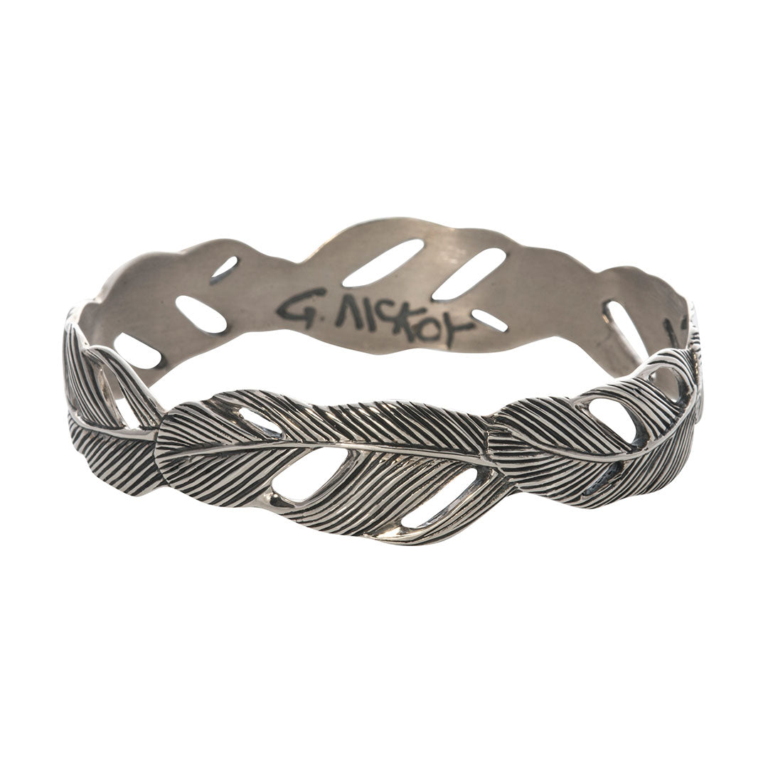 Grainger McKoy Wide Feather Bangle handmade in sterling silver. It has a truly classic look with the piercing and sculptural winding of the feathers.