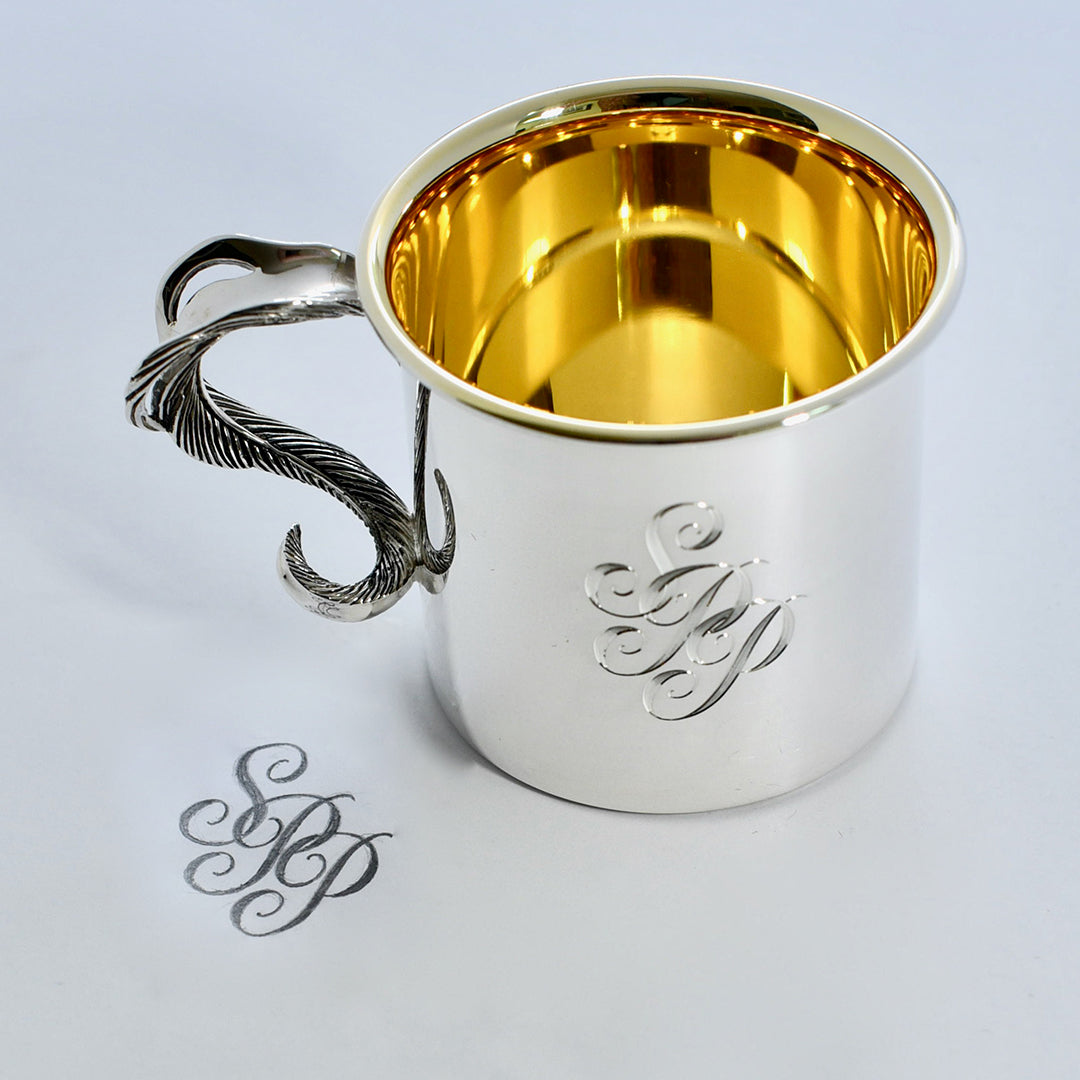 Grainger McKoy Traditional Sterling Silver Baby Cup features straight sides and an elegant feather handle hallmarked with “Grainger.” Each cup is made with over 100 grams of hand-spun .925 silver.
