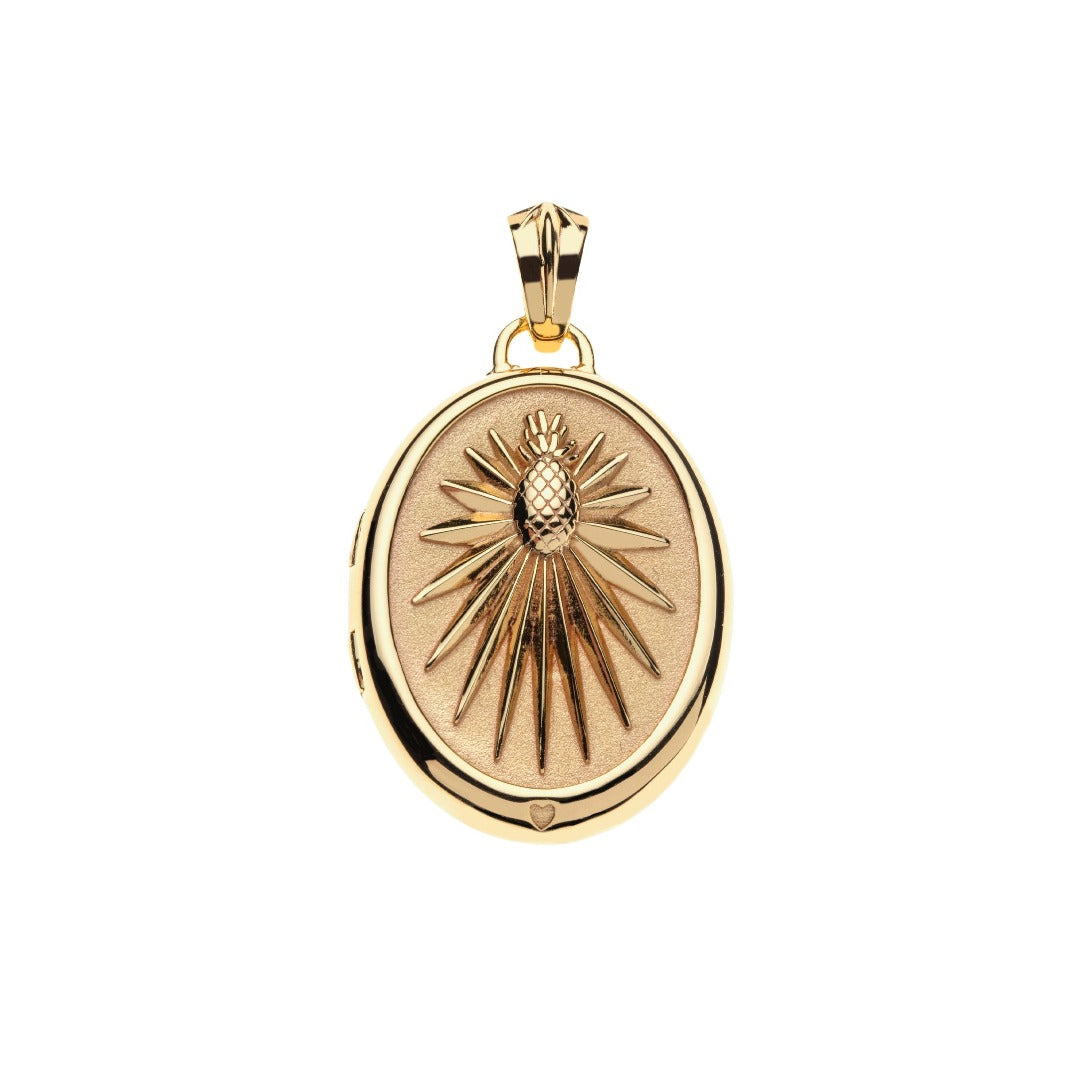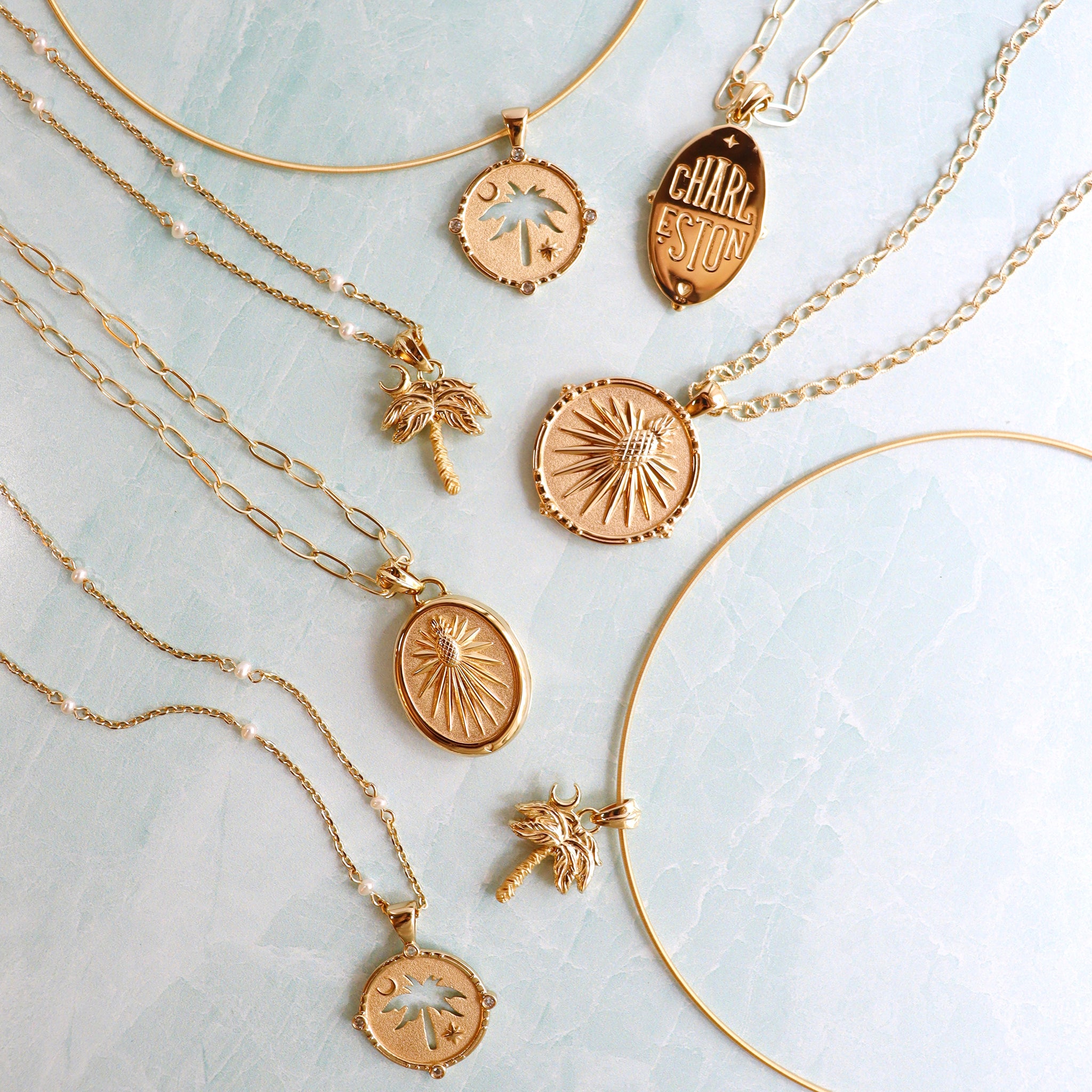 Jane Win CHARLESTON Original Locket Pendant Necklace features a pineapple and palmetto fronds design with a sandblast finish on the front and a 'CHARLESTON' inscription with the JW logo and a high polish finish on the back. The interior has two cavities for photos. This pendant comes on an adjustable drawn link chain necklace.