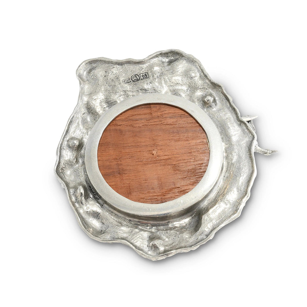 This wine coaster features a pewter figural still-life of a loyal Labrador Retriever sporting dog flushing a duck near the acacia wood pond.