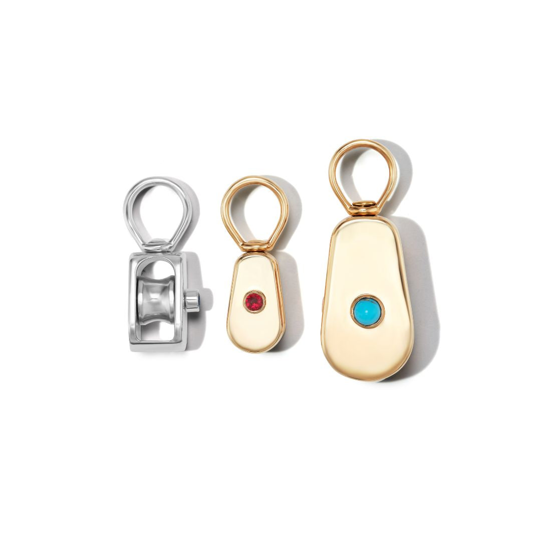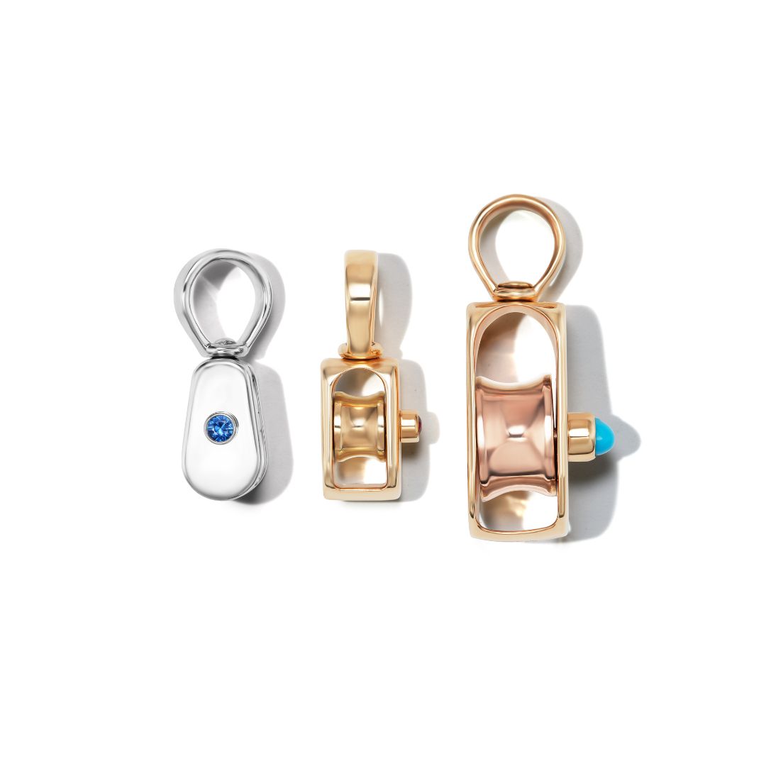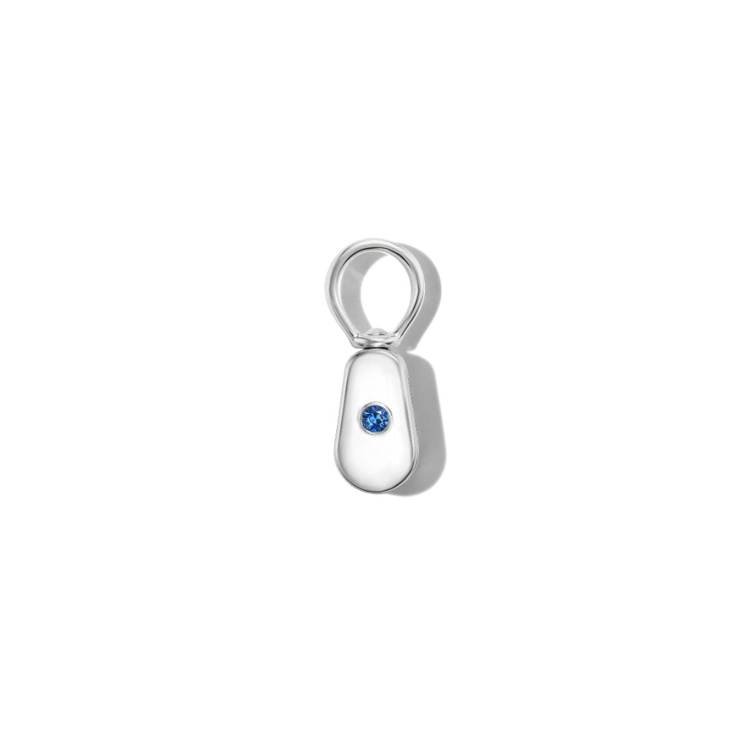 Marla Aaron Baby Pulley is handcrafted in sterling silver with a 2.3mm faceted blue sapphire. While fun to simply “play” with as a charm, the Pulley is also functional. A chain can be added at any length to add charms or to change the length of a necklace.