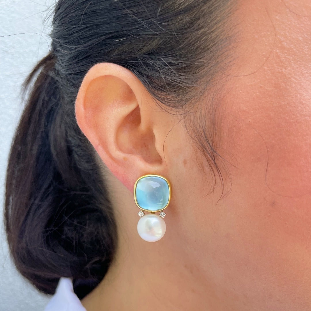This pair of Mazza earrings features cabochon blue topaz, freshwater pearls, and diamond accents set in 14K yellow gold.