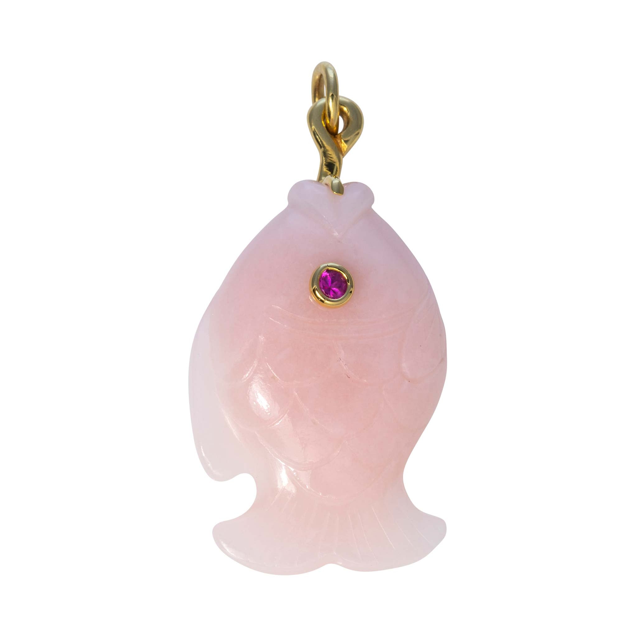 This Mazza small wide fish pendant features a hand-carved pink opal fish with a bezel set pink sapphire eye in 14K yellow gold.