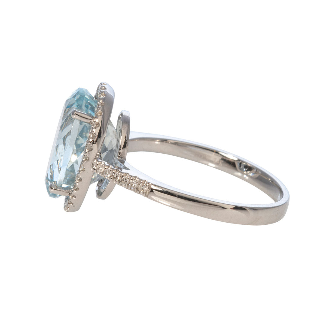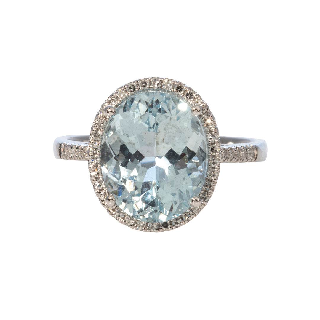 This ring features an oval aquamarine center surrounded by a halo of pavé diamonds with side diamond accents set in a 14K white gold mounting. This ring is an ideal choice for an alternative bride or a great gift for a March birthday.