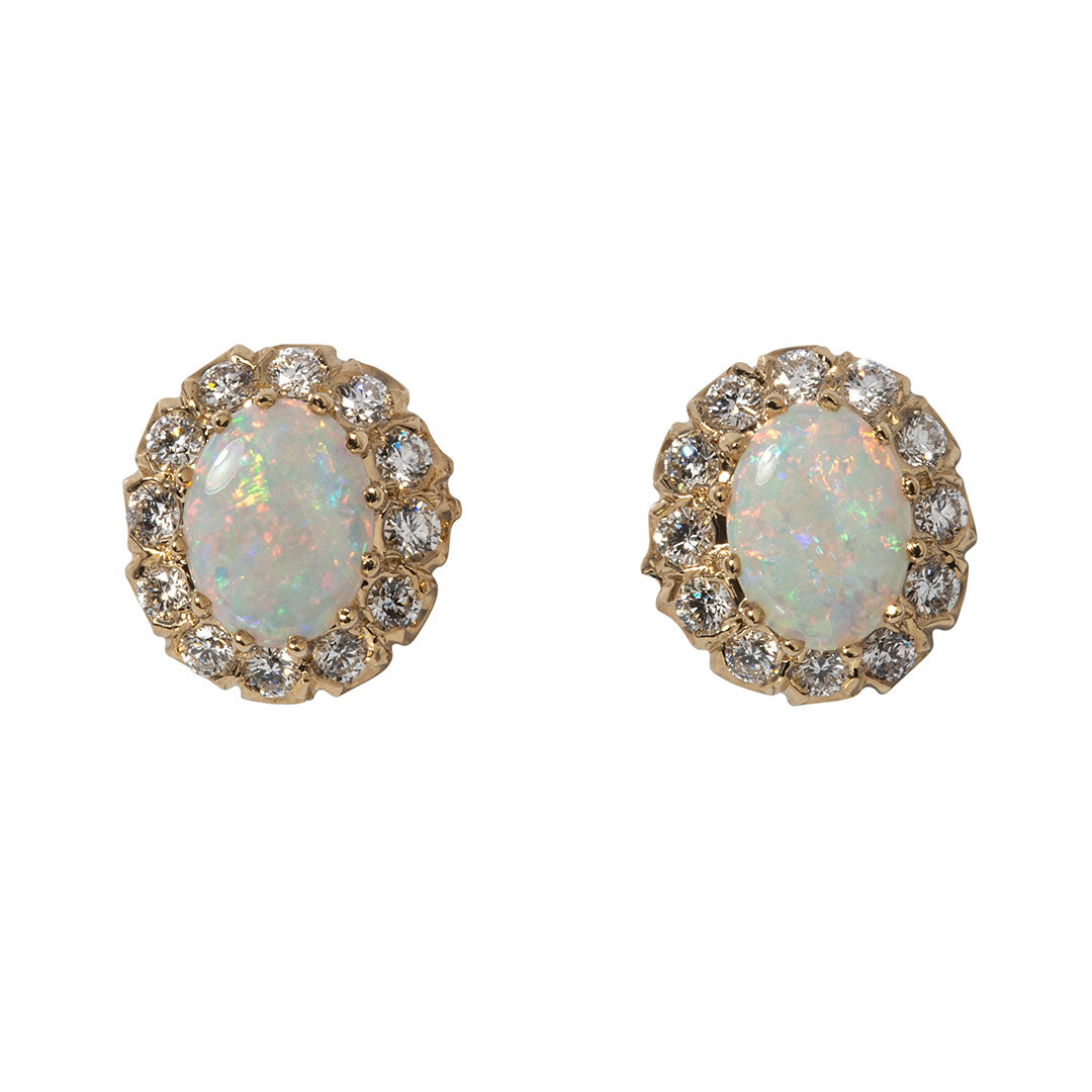 This pair of cluster earrings features oval opal centers surrounded by round brilliant diamonds set in 14K yellow gold.