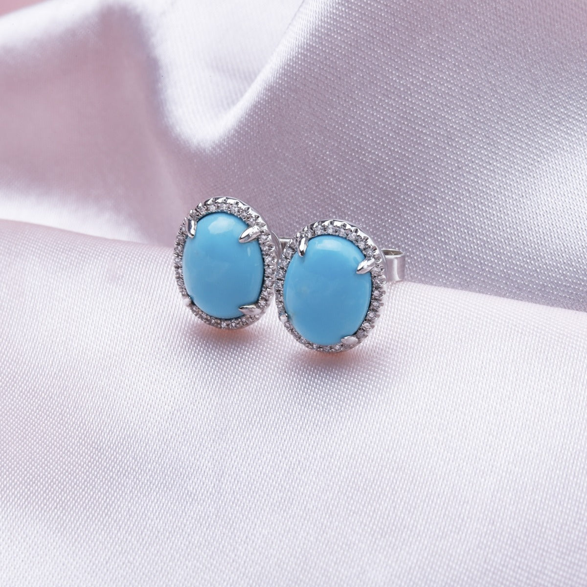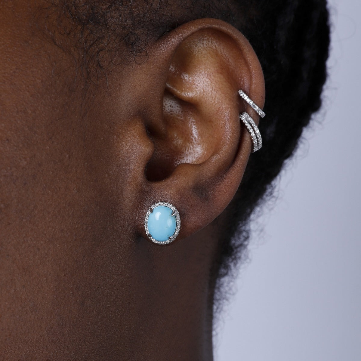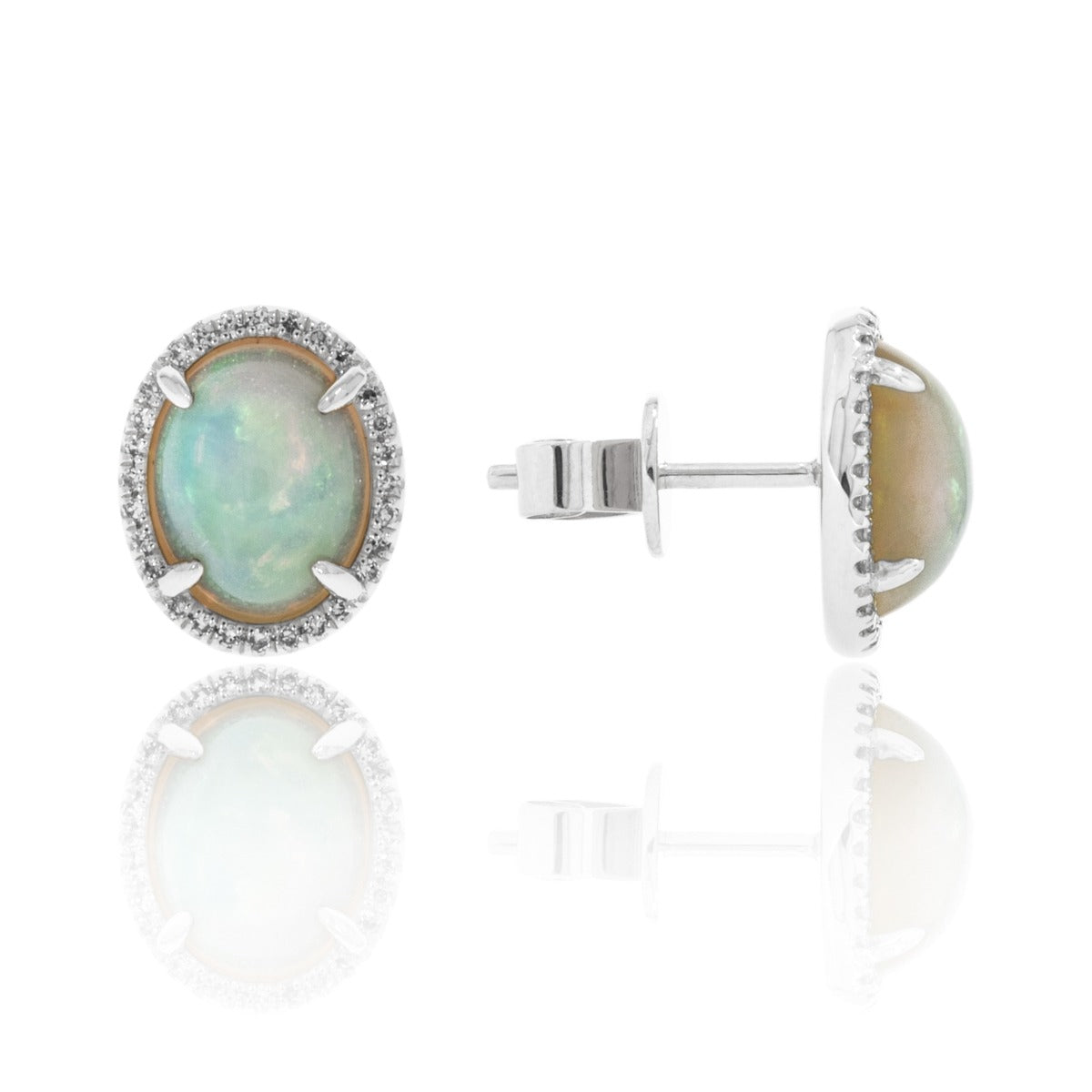 This pair of oval-shaped stud earrings feature cabochon opal centers surrounded by a halo of pavé round diamonds in 14K white gold.