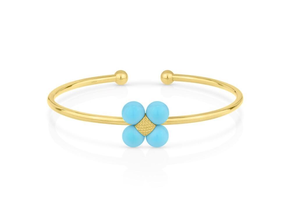 Paul Morelli Sequence Bangle features a cluster of 7mm turquoise spheres on an 18K yellow gold flexible tube open cuff.
