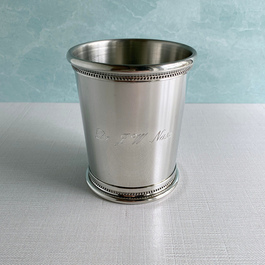 This pewter reproduction beaded edge Governor’s Julep Cup features a Caduceus or Staff of Hermes medical symbol appliqué.