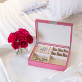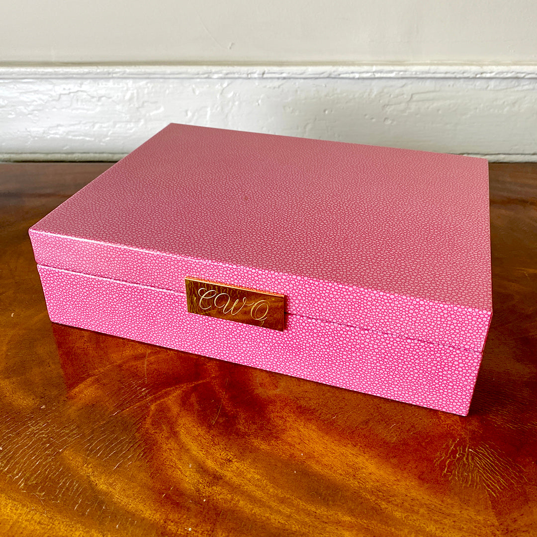 This large jewelry box features a pink polished shagreen finish and a bright gold-plated clasp with matching hinges. With a luxuriously soft suede interior, this jewelry box is perfect for keeping precious items safely stored.