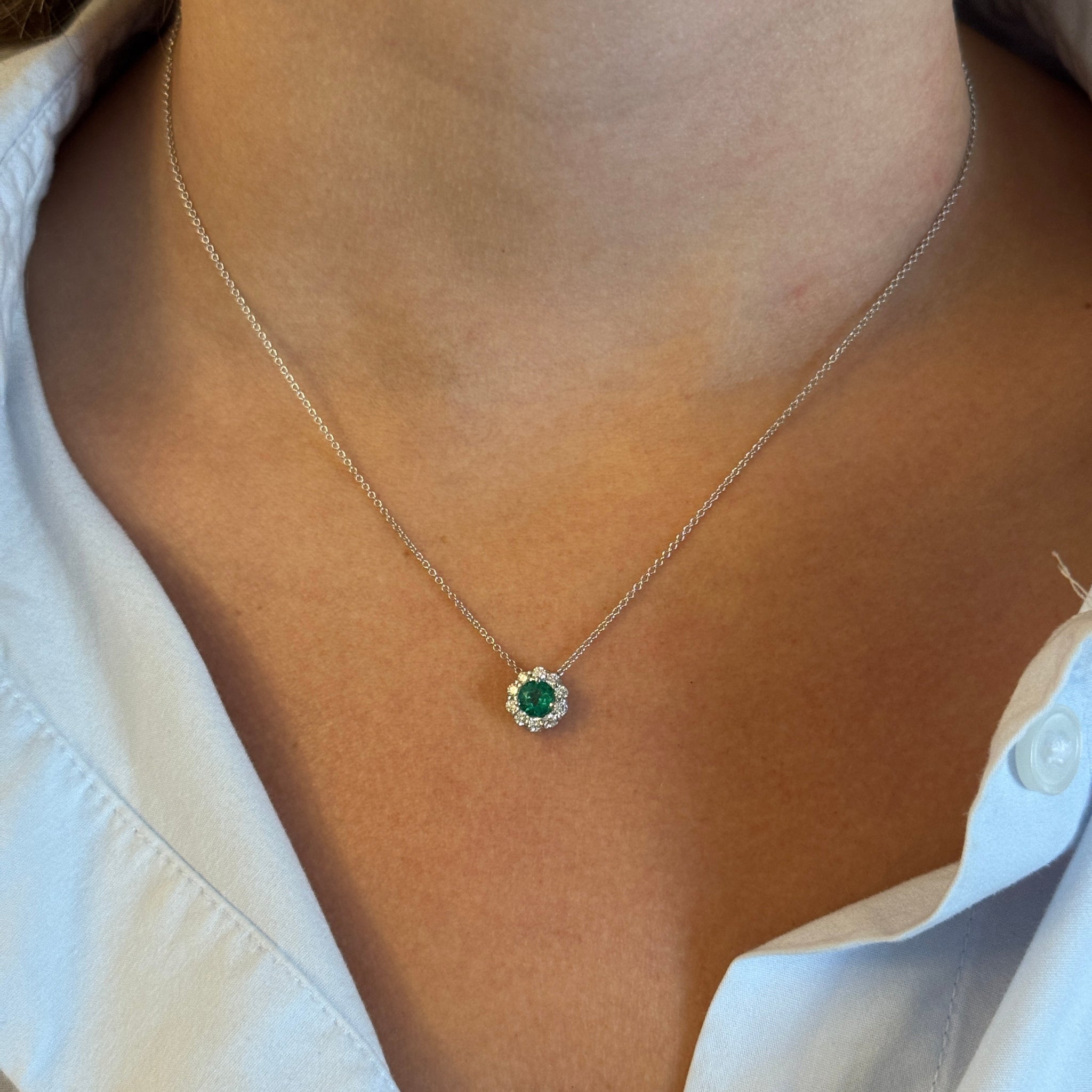 This pendant necklace features a round emerald center surrounded by a halo of round brilliant diamonds in 18K white gold on a cable chain.