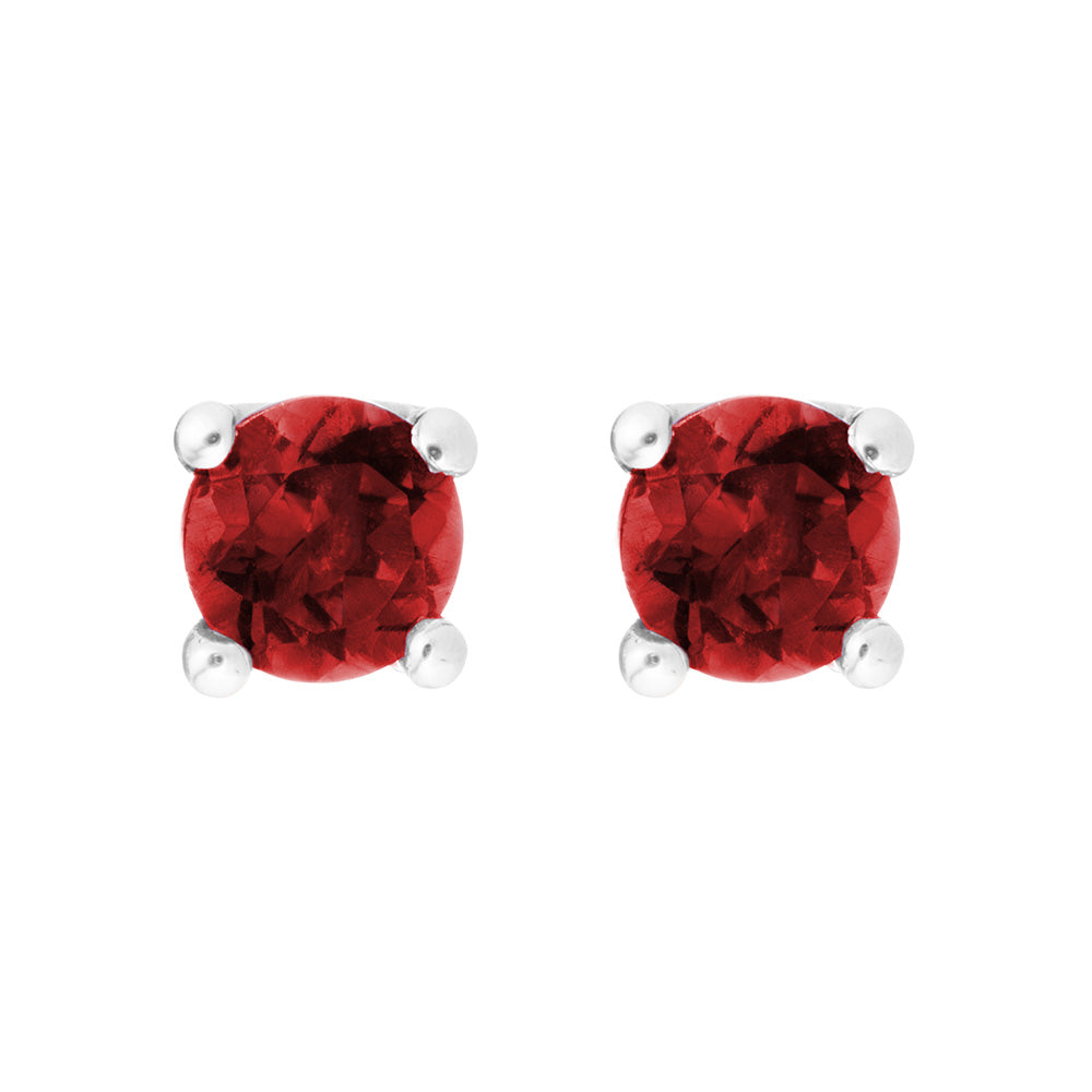 This pair of birthstone stud earrings feature round ruby stones prong-set in 14K white gold with postbacks for pierced ears.