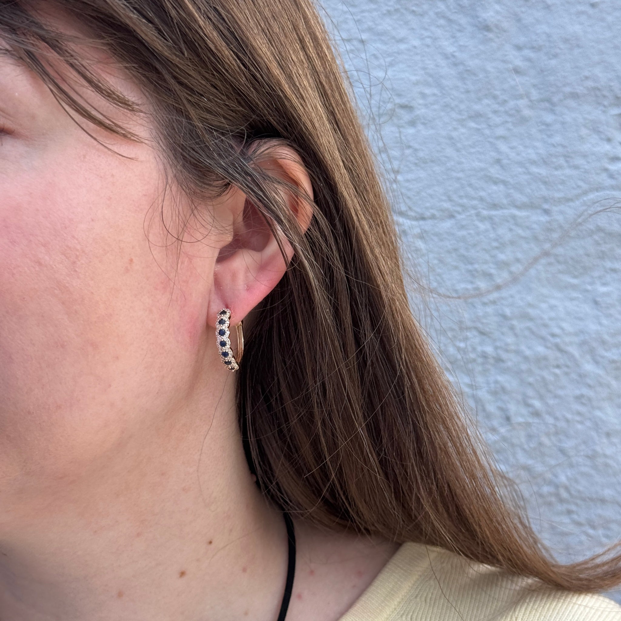 This pair of small hoop earrings features round blue sapphires surrounded by halos of round brilliant diamonds pavé set in 14K yellow gold. Each hoop has seven sapphires.