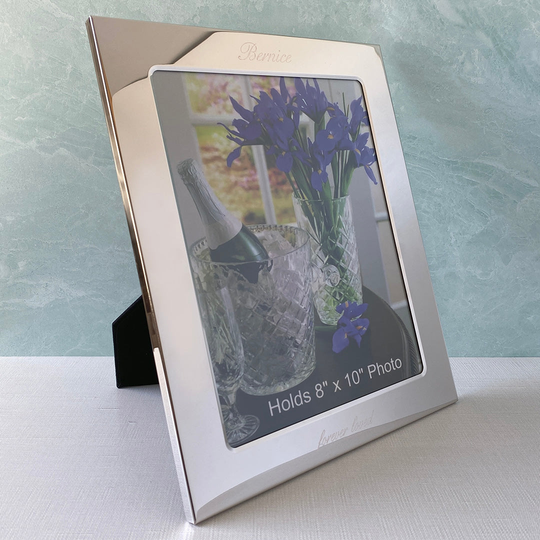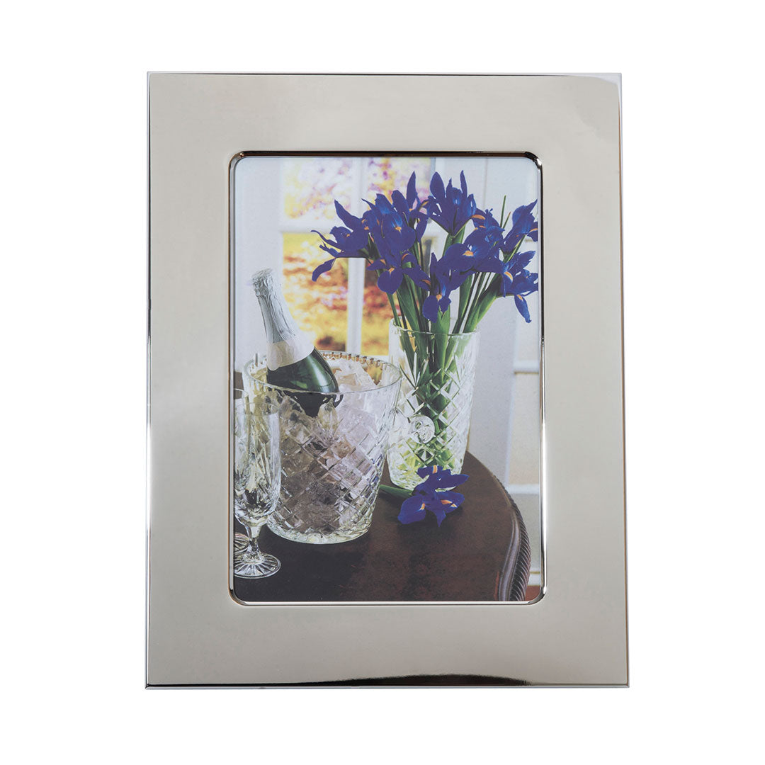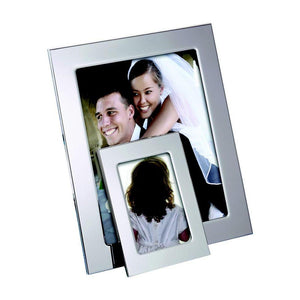 This picture frame features a polished non-tarnish silver-plated metal border and black flocked cloth backing with a two-way easel.