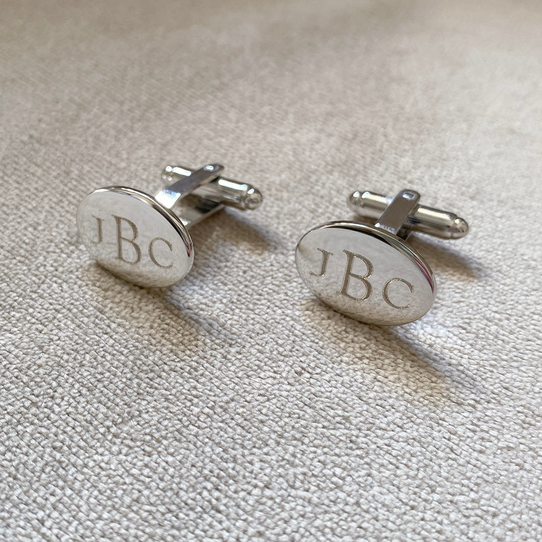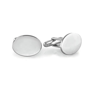 A pair of plain, polished silver-plated finish oval-shaped cuff links.