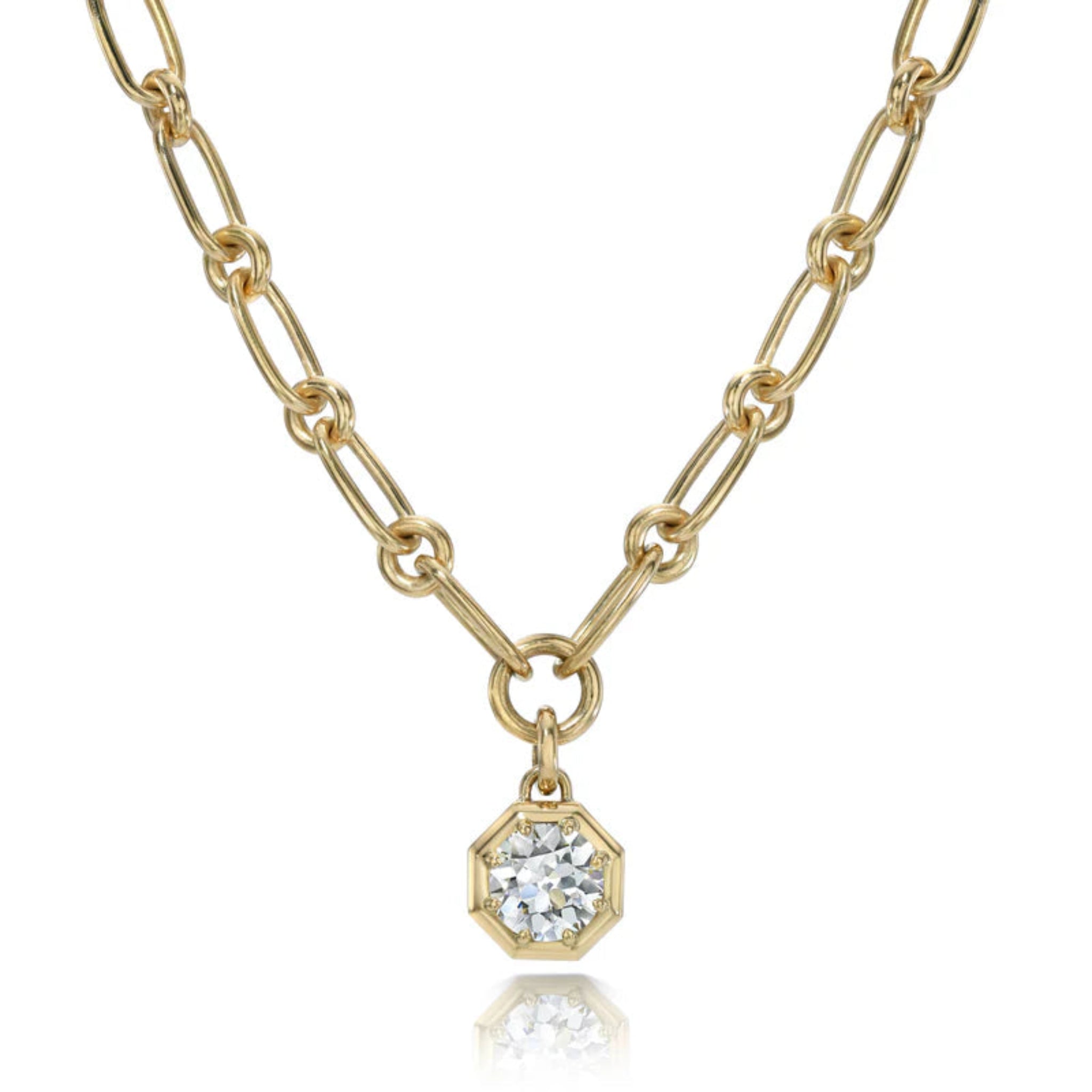 Single Stone Lola Necklace features a prong-set Old European cut diamond pendant on a handcrafted 18K yellow gold Lo chain.