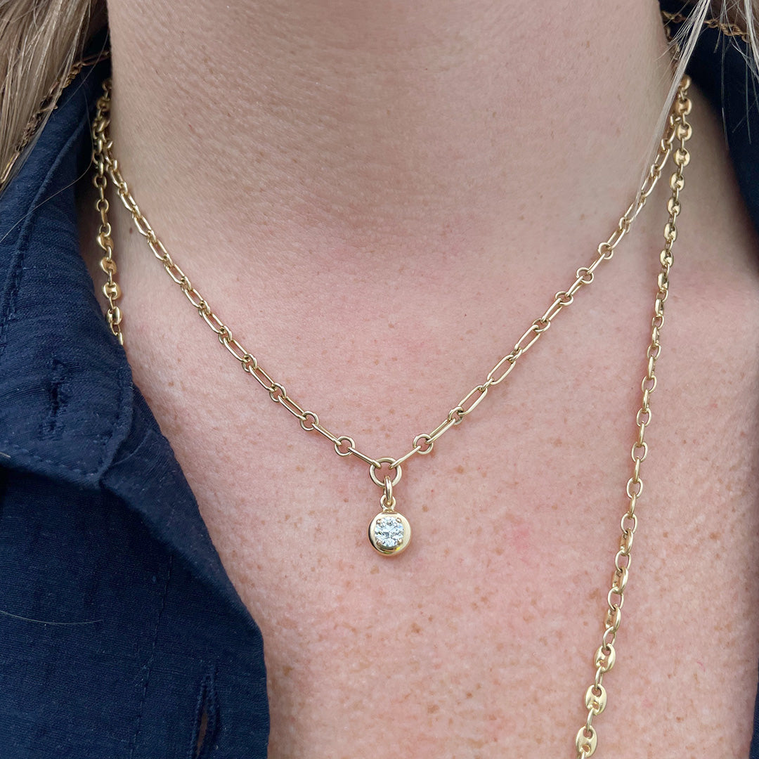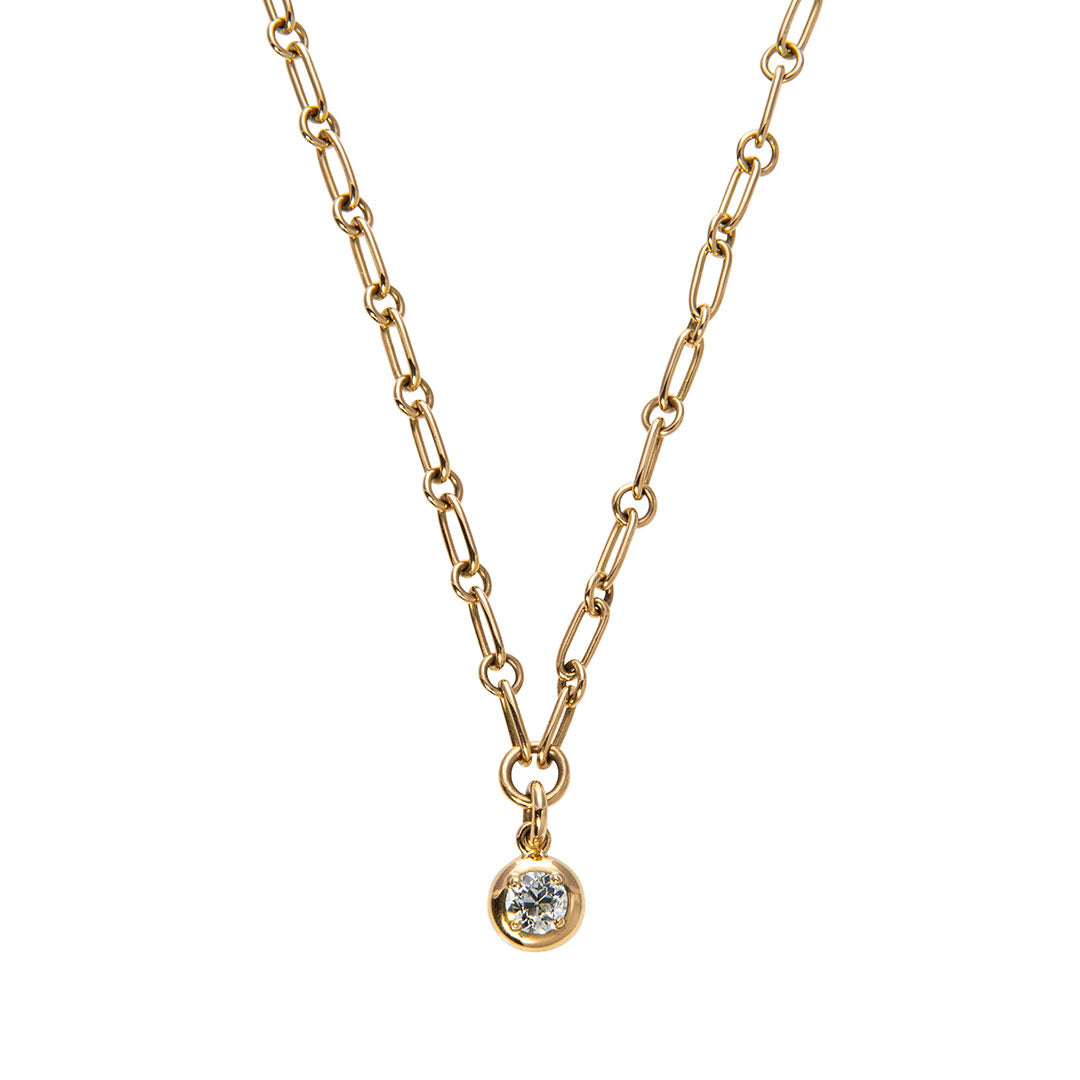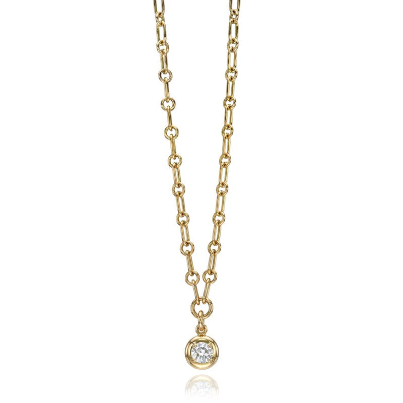 Single Stone Randi Drop Pendant Necklace features an Old European cut diamond prong set on a handcrafted 18K yellow gold Mini Lo chain.