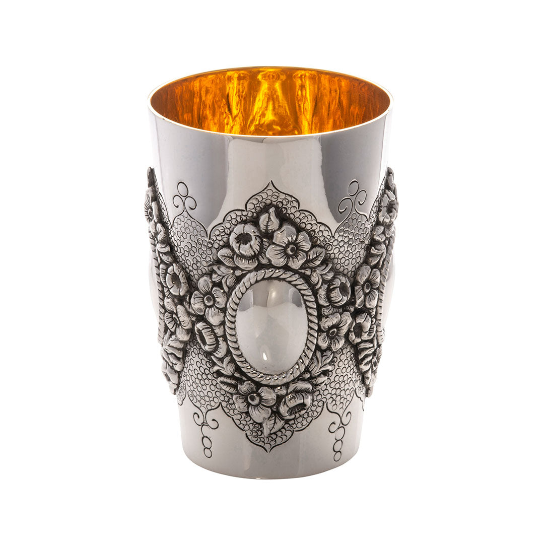 This Old World-style Celebration Cup is crafted in sterling silver featuring heavily ornate, detailed floral oxidized repoussé surrounding four oval cabochon cartouches around the cup and a gold wash finish on the inside.