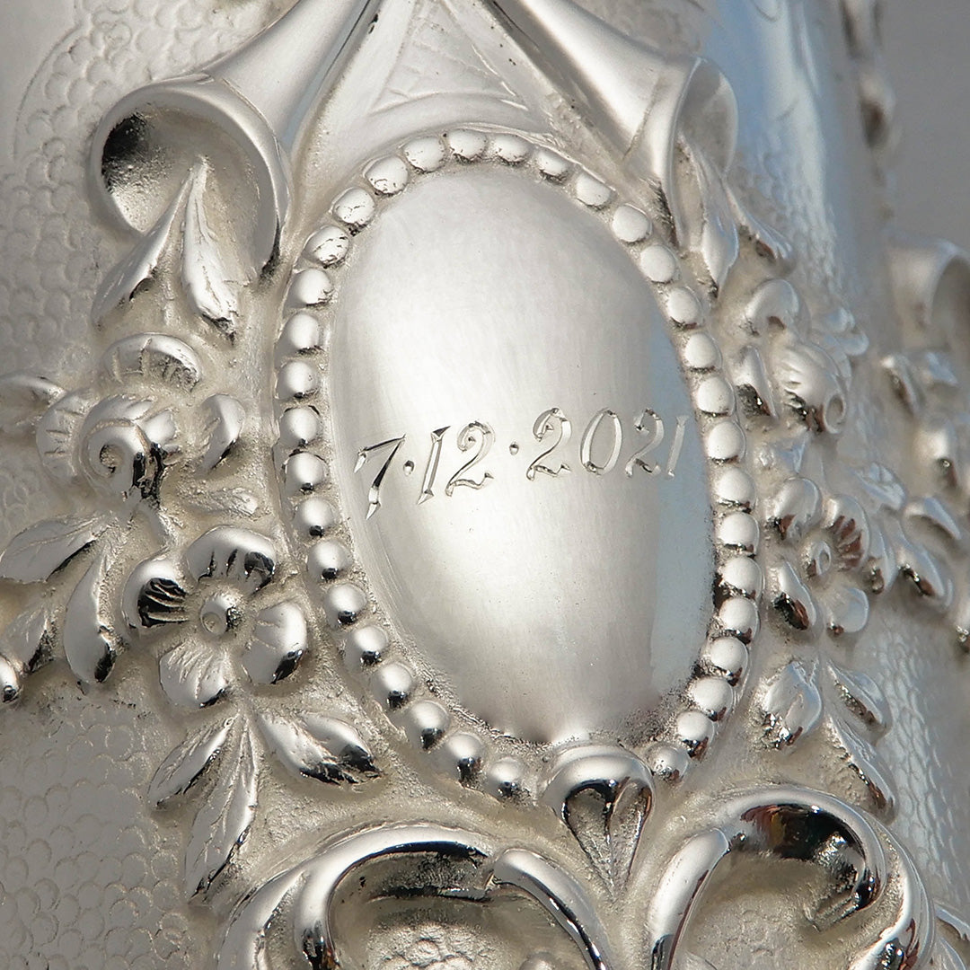 A traditional Southern gift for a newborn, this ornate cup features four cartouches for hand engraving a monogram, birth date, christening date, and marriage date.