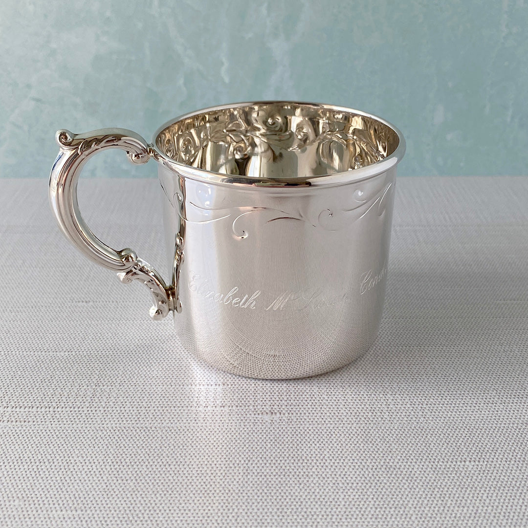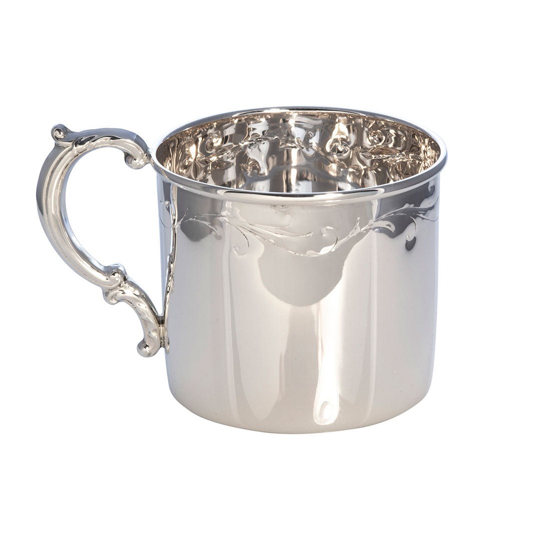 This sterling silver baby cup features a floral scroll pattern around the top and a handle with an ornamental scroll design.