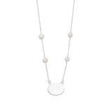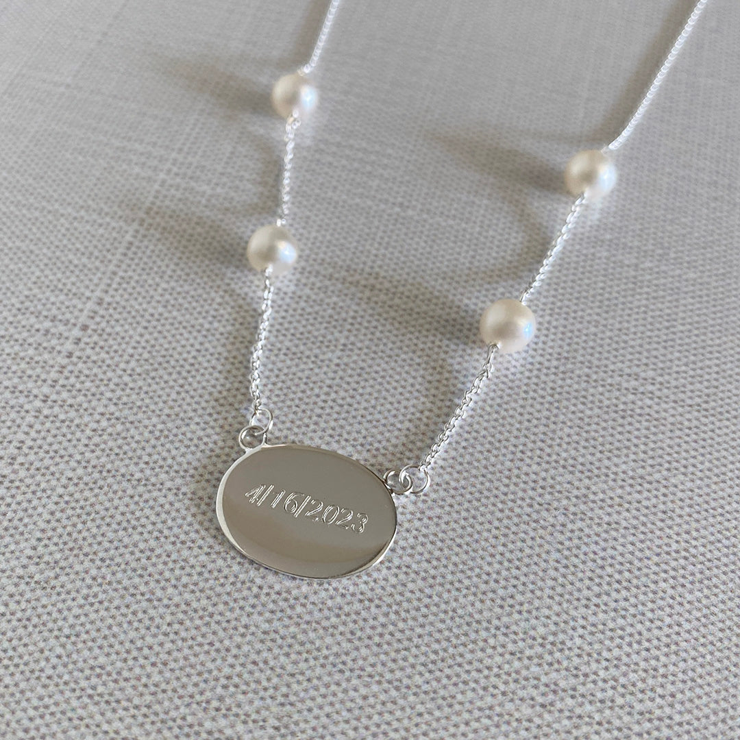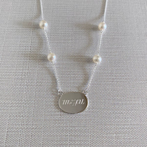 This necklace features a personalizable oval nameplate ID tag pendant on a split chain with 4 cultured freshwater white pearl stations on the chain in sterling silver.