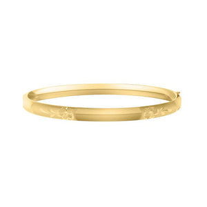 A teen-size polished 14K yellow gold-filled signet bangle bracelet featuring space for personalization flanked by floral engraving in a satin finish. The outer shell is solid gold pressure-bonded to an inner core of high-quality brass.