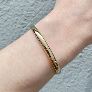 A teen-size plain polished 14K yellow gold-filled bangle bracelet. The outer shell is solid gold pressure-bonded to an inner core of high-quality brass.