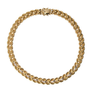 Croghan’s exclusive classic rope chain necklace with a smaller width, The Petite Club Necklace with diamonds! This necklace is handcrafted in 14K yellow gold, featuring double rope chain twists in a braided design with diamond accents and a single diamond accent on the clasp. The clasp is personalized for you with a hand-engraved monogram.