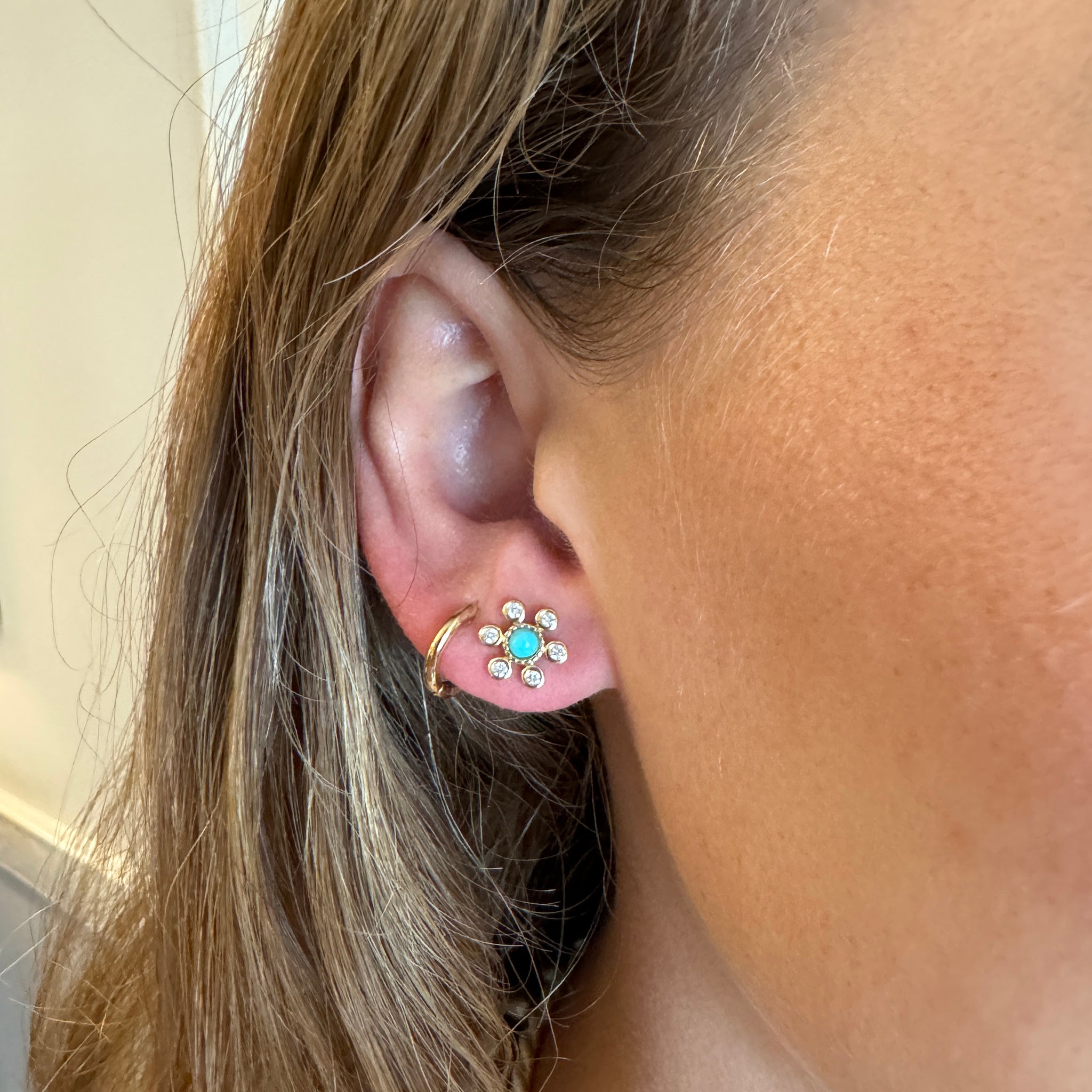 Turquoise & Diamond Halo Bezel Set 14K Gold Stud Earrings