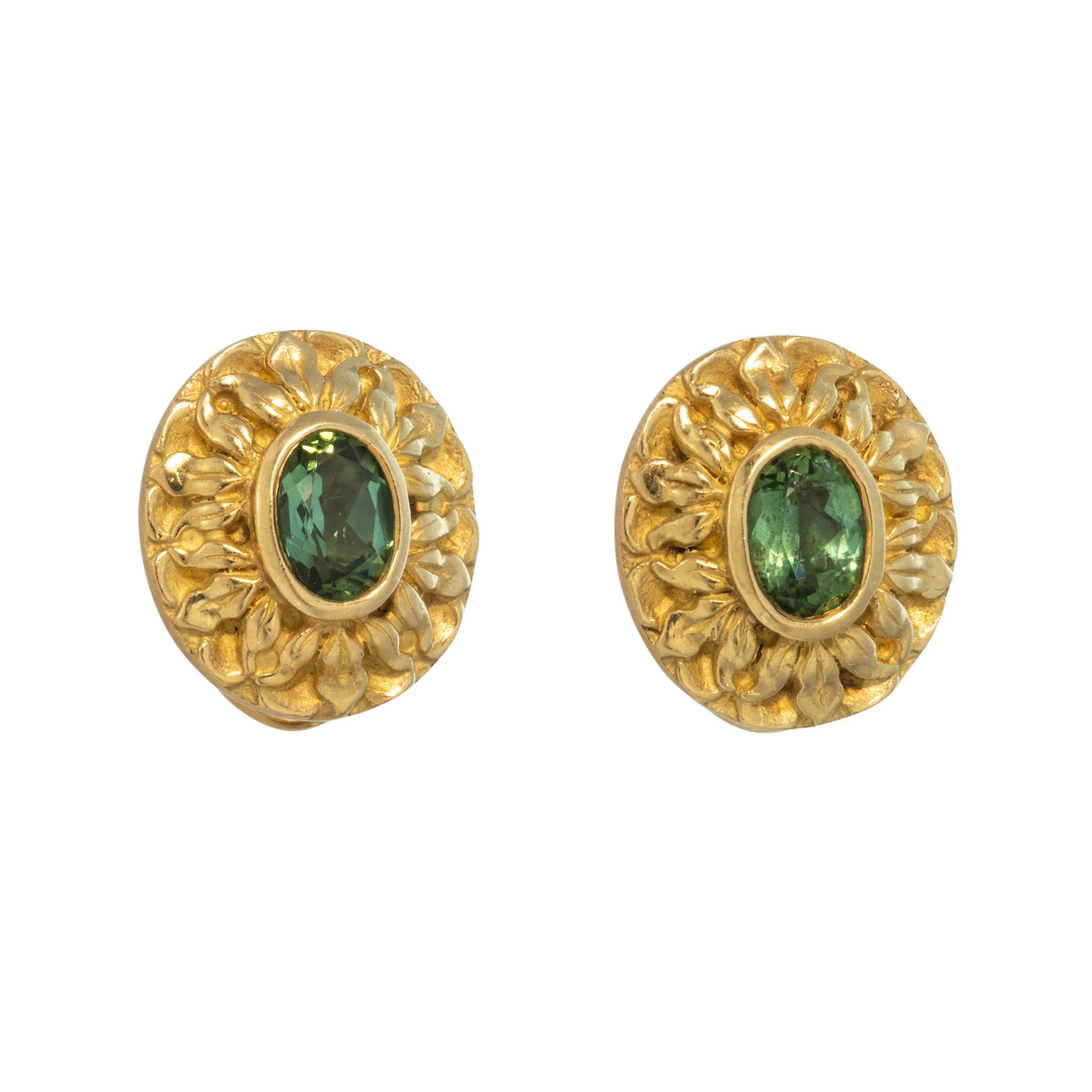 From our estate and antique collection, this pair of vintage earrings features oval green tourmaline centers bezel set in hand-engraved floral 18K yellow gold mountings.