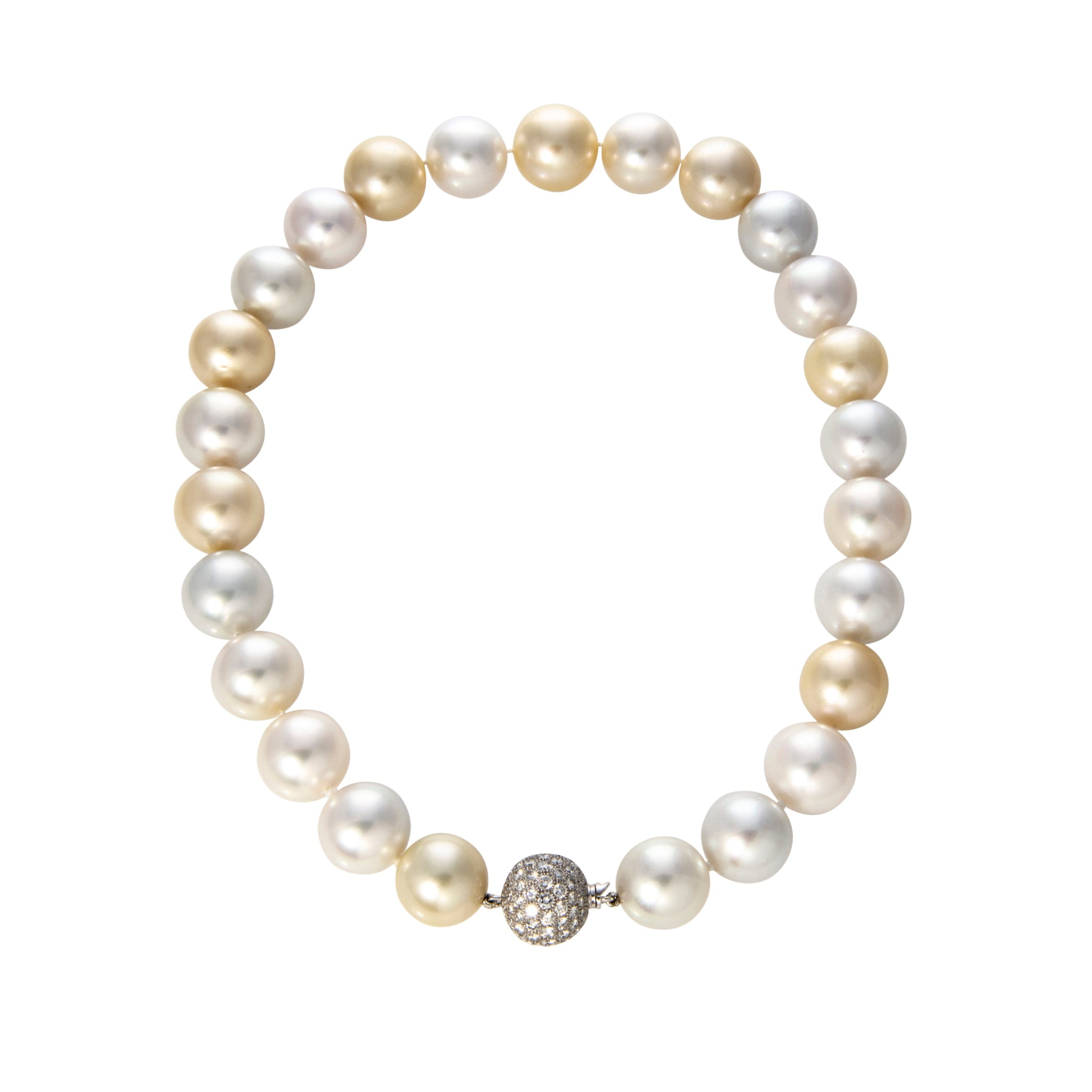 From our estate and antique collection, this vintage necklace features a strand of twenty-five graduated golden and white South Sea pearls and a sphere ball clasp in 18K white gold with pavé round brilliant diamonds.