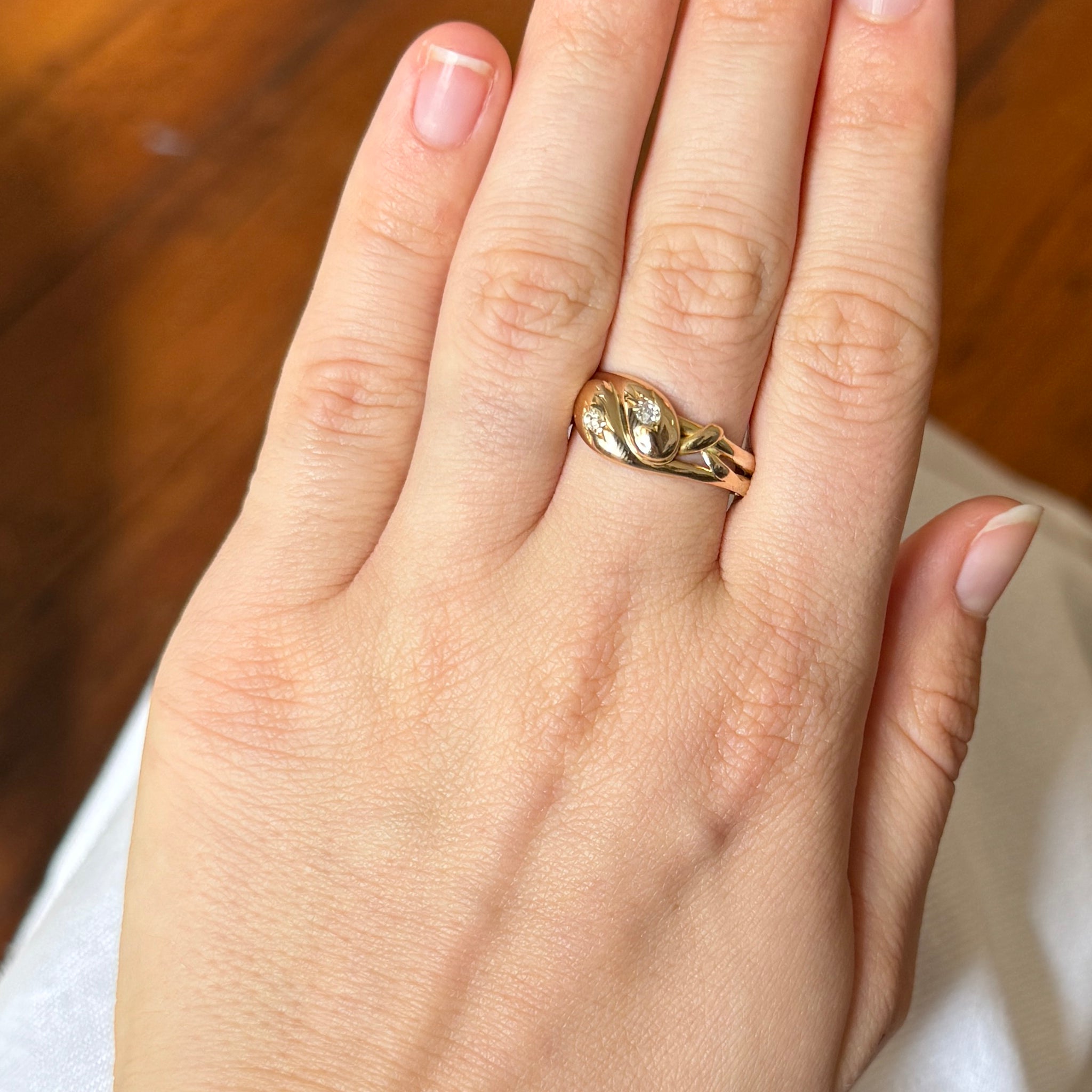 From our estate and antique collection, this vintage double snake ring features two coiled serpents with a diamond set on each head in 18K rosy yellow gold.