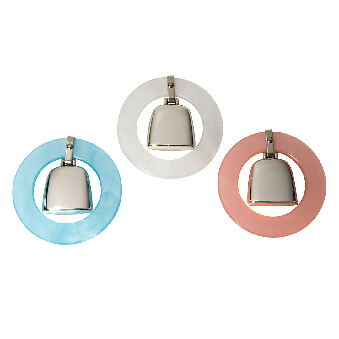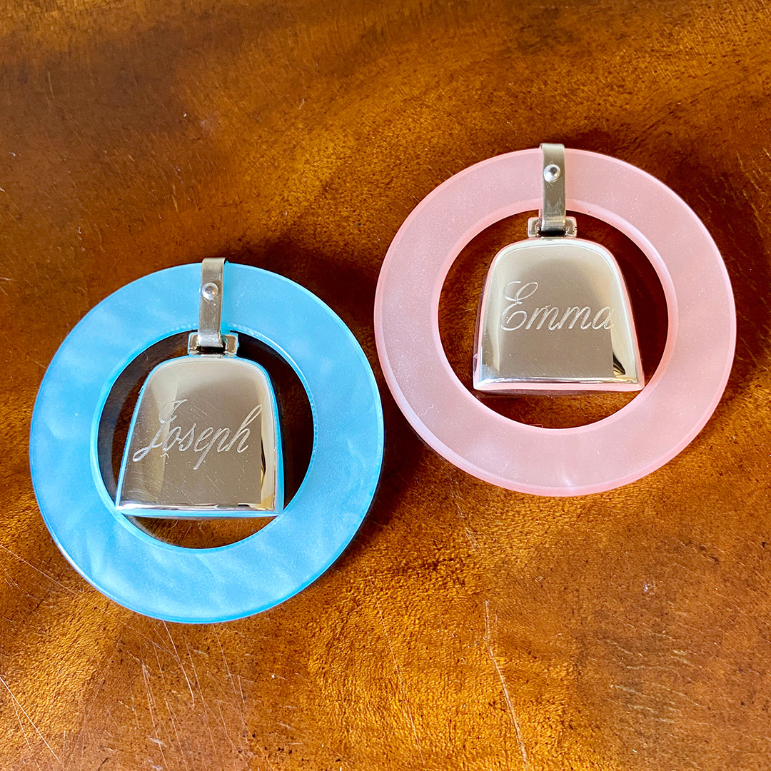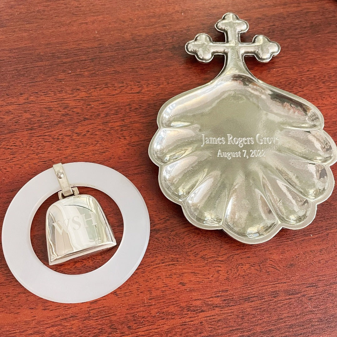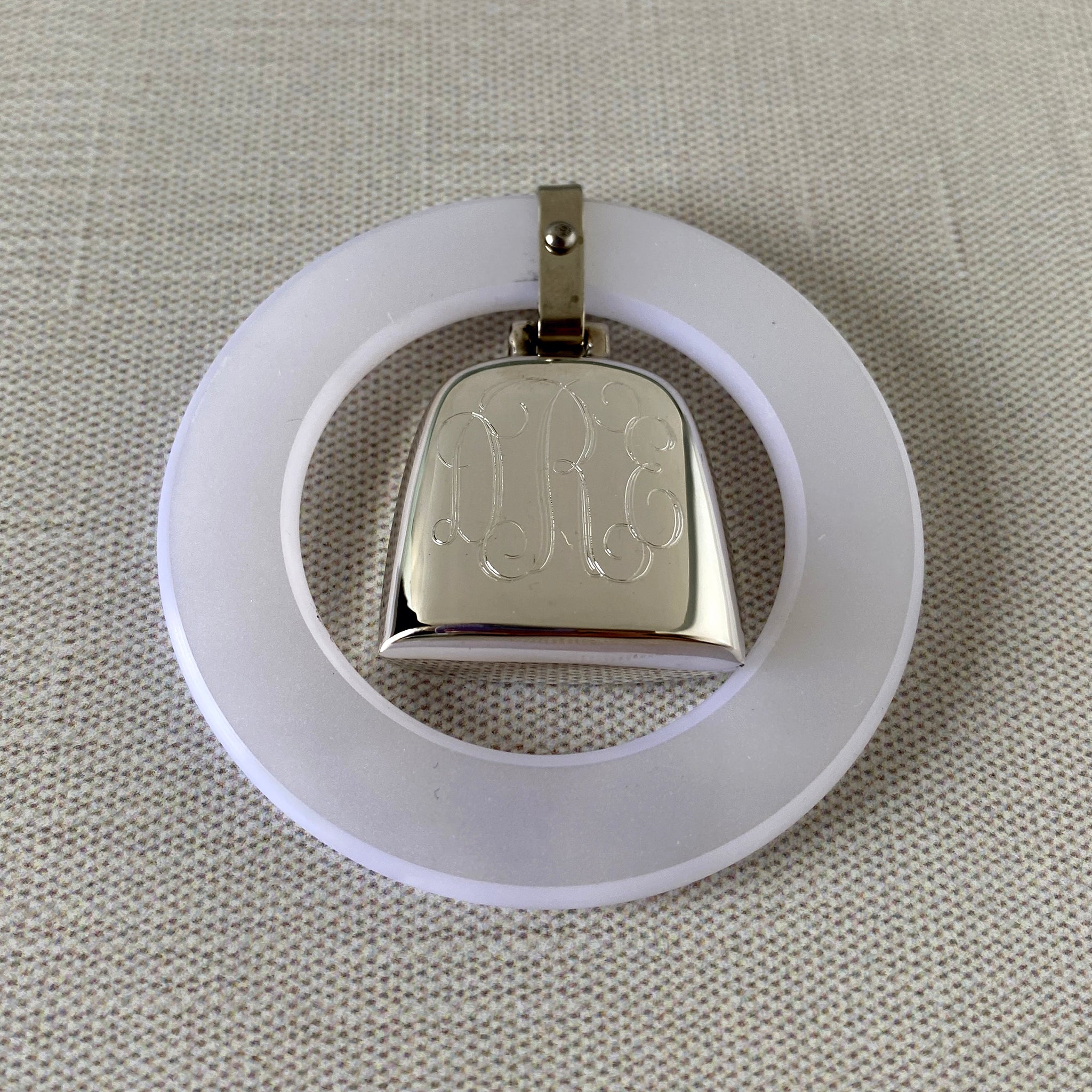 Give an exquisite heirloom baby gift that will last for generations! The sterling silver rattle bell is attached to the attractive white marbleized plastic teething ring that is safe for babies. The rattlebell is just the right size to engrave a baby’s monogram. This is a gift that is sure to be a cherished favorite.