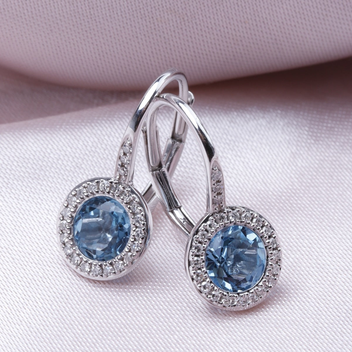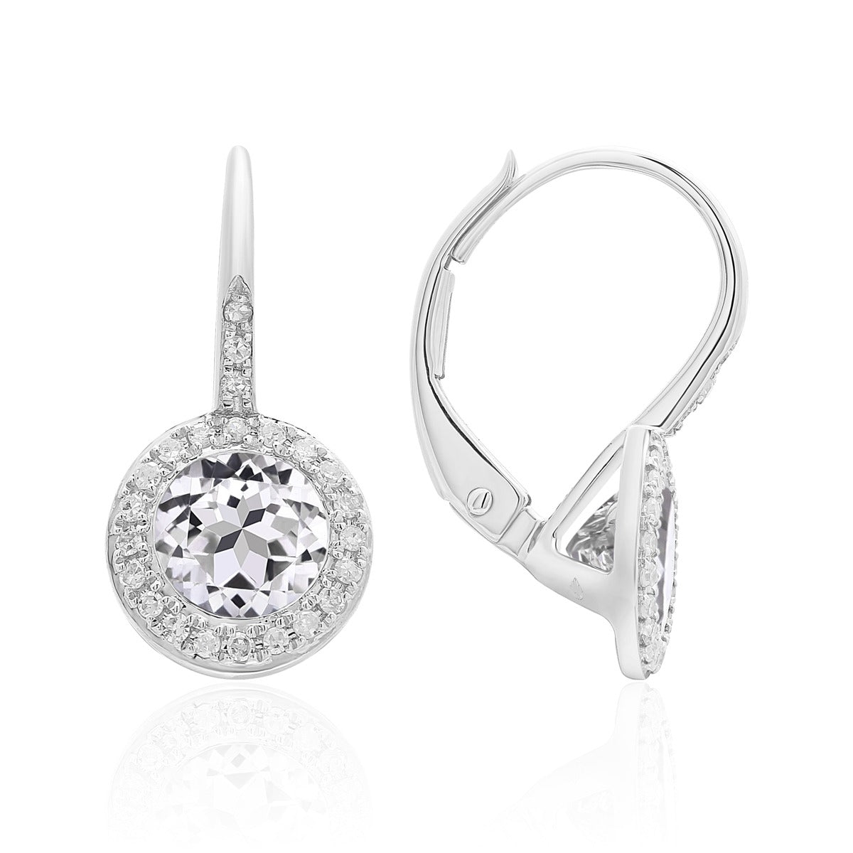 This pair of halo martini lever back earrings features a round white topaz center surrounded by pavé round brilliant diamonds in 14K white gold.